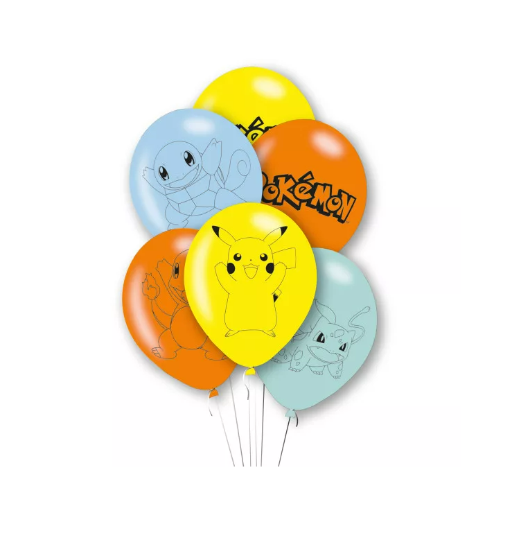 6 gekleurde Pokemon ballonnen in verschillende kleuren.