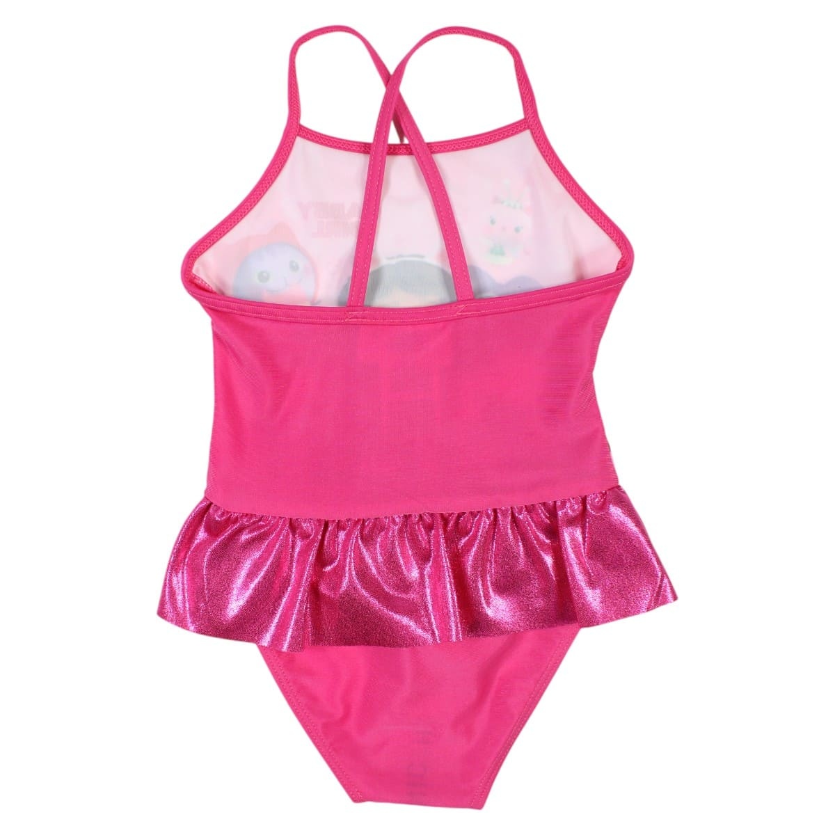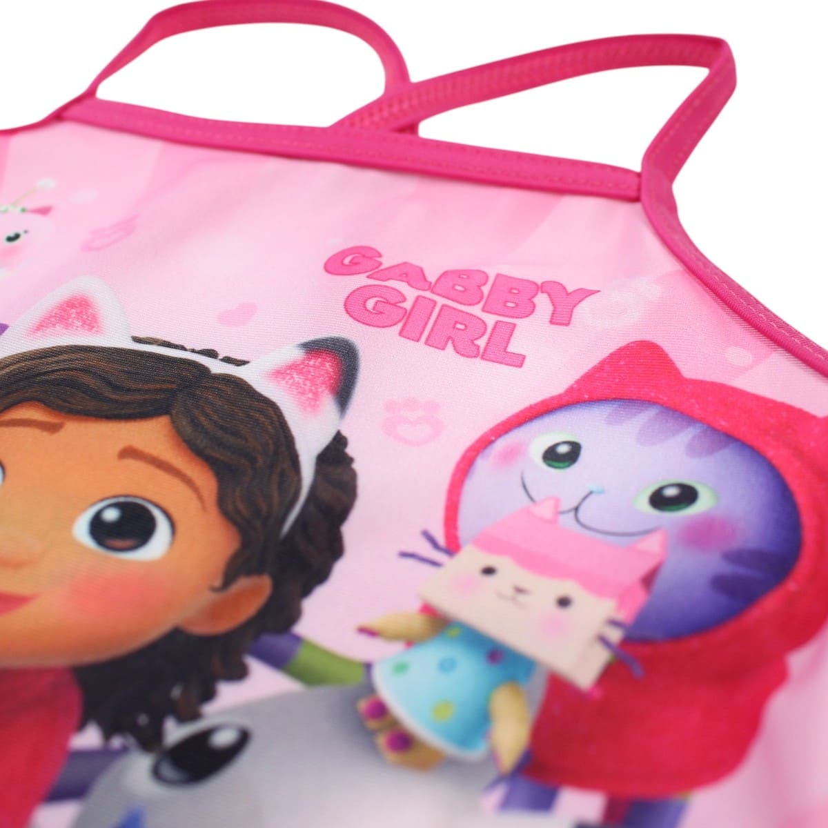 Op de voorkant van dit leuke zwempak staan Gabby, Cakey, Meerminkat, Pandy Poek, DJ Kattenkruid, Babybox Kat, Purrific Kat en Doerak.