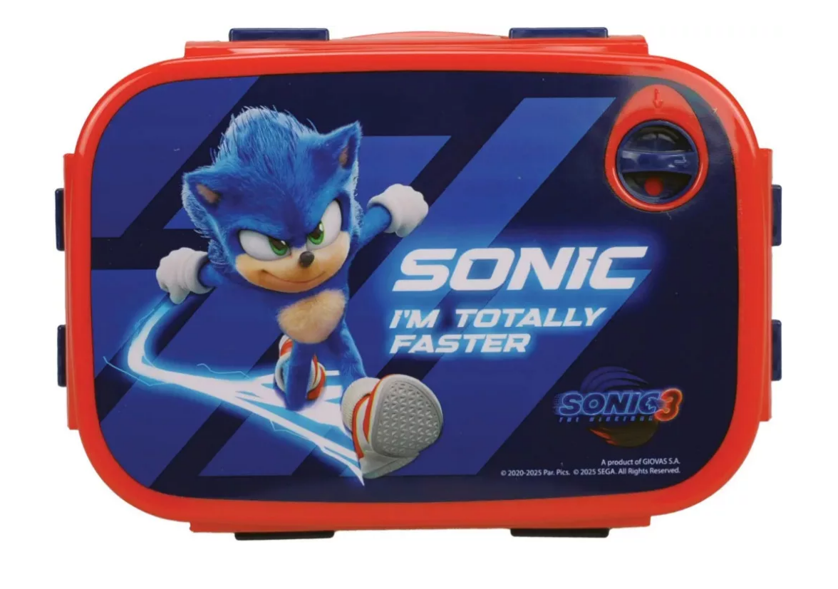 Het sluitsysteem met zijclips garandeert een luchtdichte en veilige sluiting, waardoor het risico op accidenteel openen wordt voorkomen. Het kleurrijke deksel, versierd met het officiële Sonic 3-logo, is ook voorzien van een ventiel om voedsel langer vers te houden.