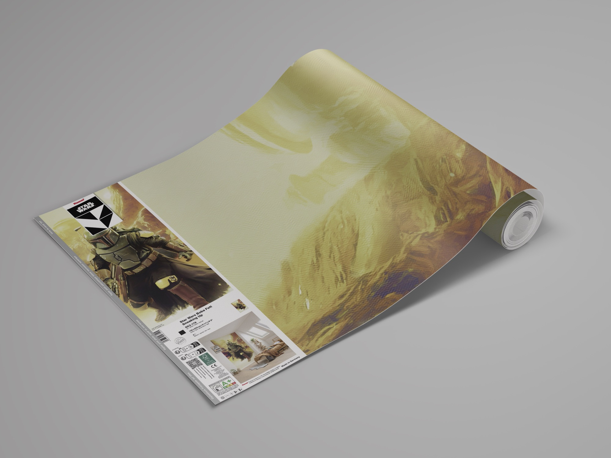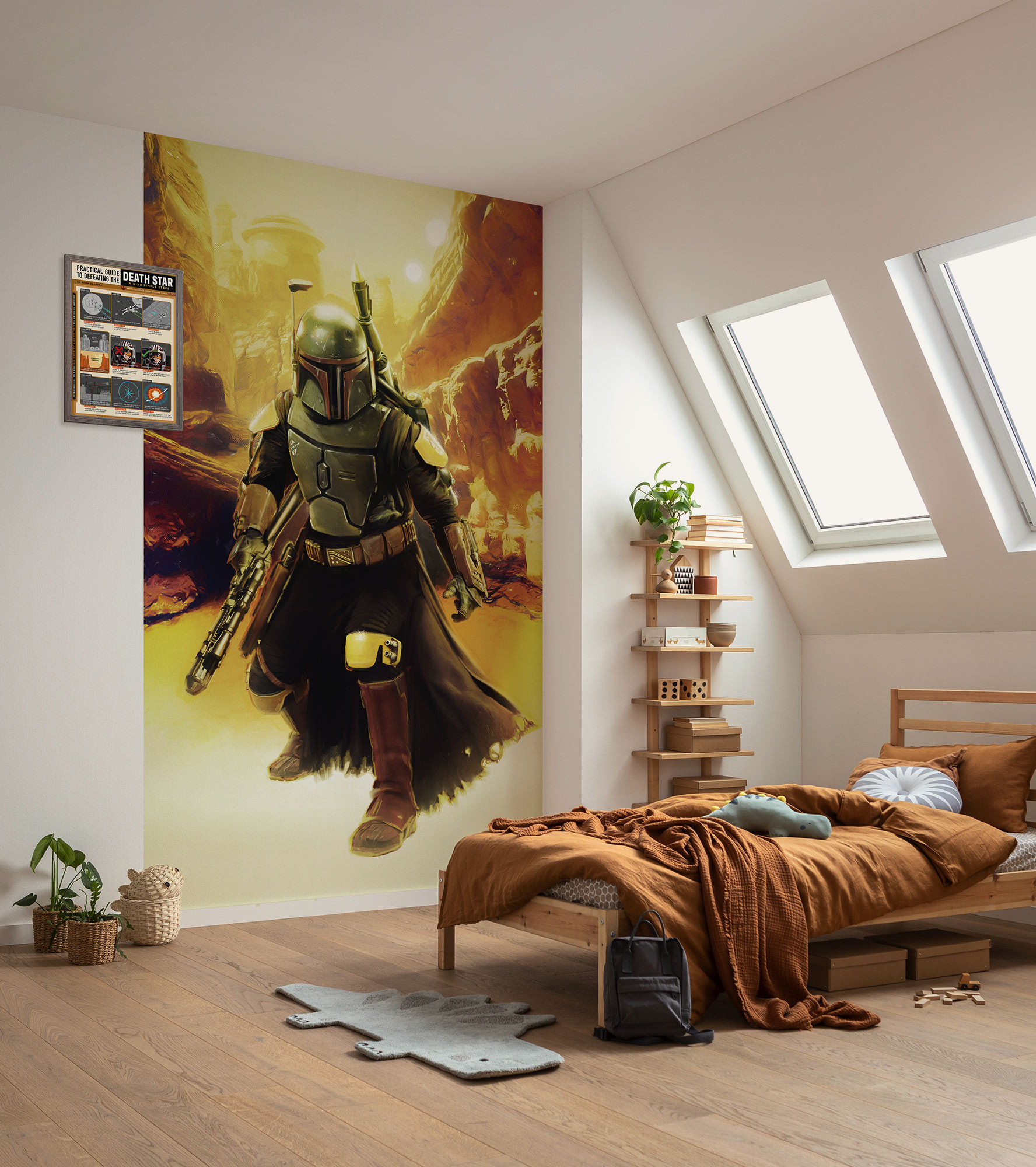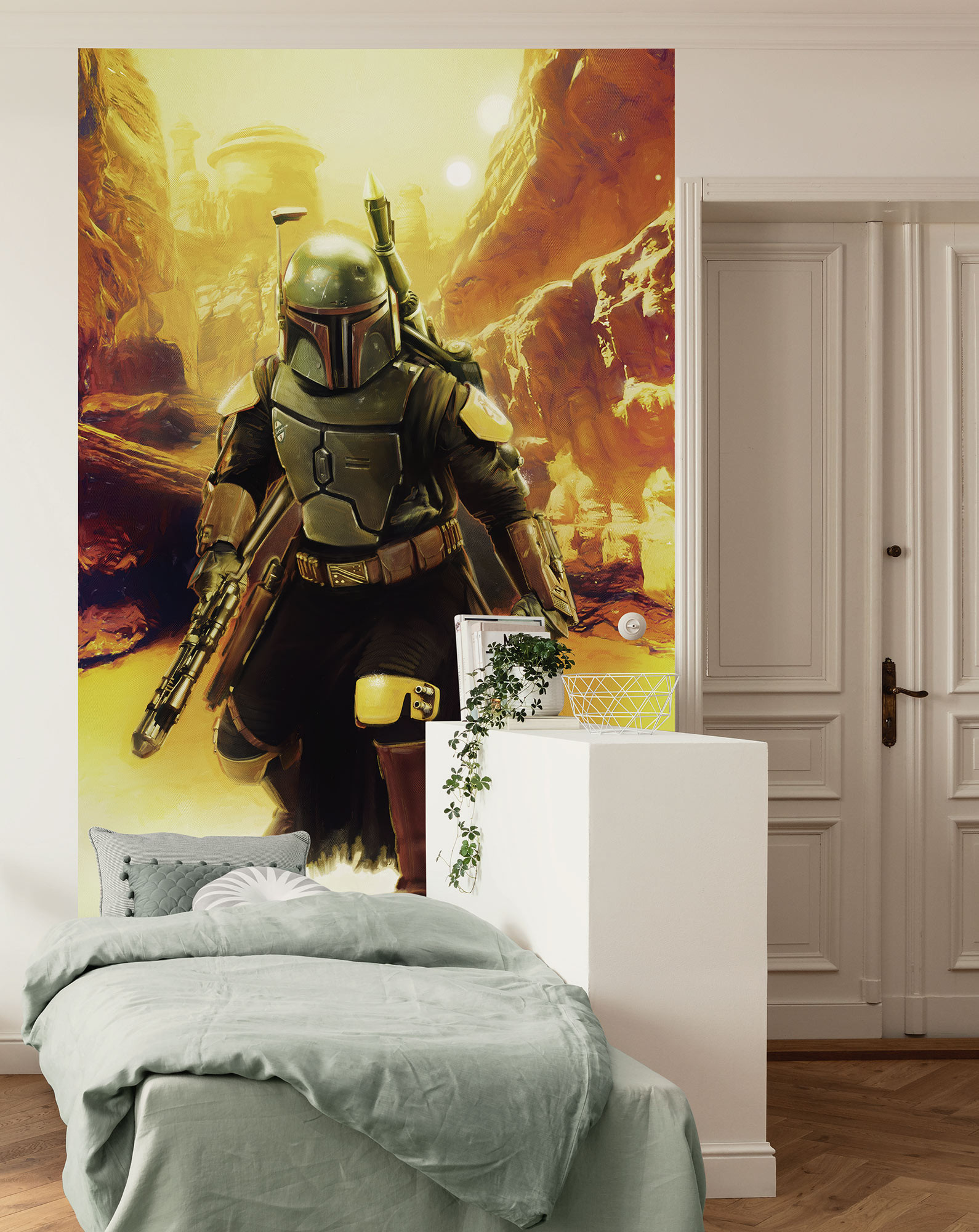 Dit mystieke, suggestieve behangontwerp van Star Wars-personage Boba Fett straalt in heldere oranje-gele tinten die warmte in de kamer verspreiden en de kijkers naar een andere wereld voeren.