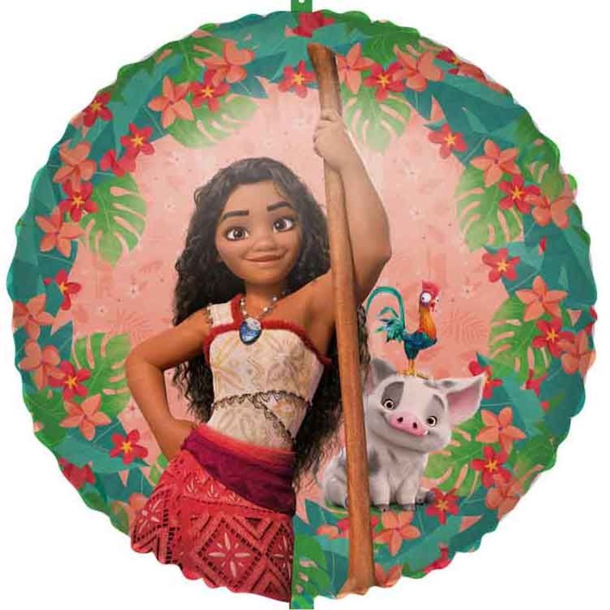 Vaiana Folie ballon welke gemaakt is van dun alu folie en heeft een afbeelding met Vaiana, Heihei en Pua.